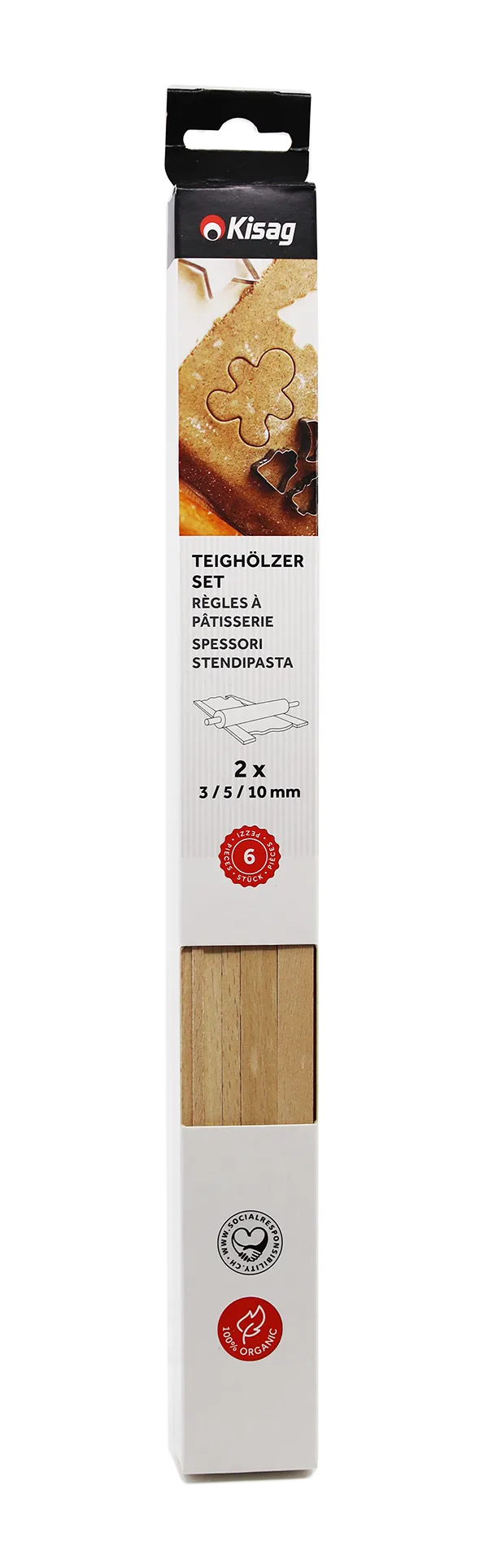 Set bestehend aus einem 2er-Teigholz 3 mm, einem 2er-Teigholz 5 mm und einem 2er-Teigholz 10 mm. Länge je 35 cm. Aus FSC®-zertifiziertem europäischem Buchenholz und 100 % recycelbar.