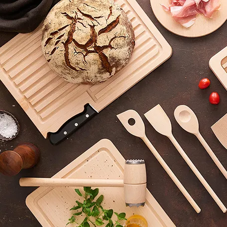 Antibakteriell, messerschonend, 100% FSC®-Buchenholz, Saftrille, Schneidebrett, Servierbrett, Untersetzer, einfache Reinigung, pflegeleicht und langlebig. Was braucht man mehr?