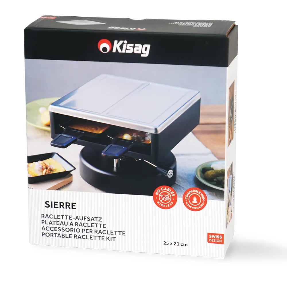 Mit dem kabellosen Raclette-Aufsatz SIERRE gehört dieses Risiko der Vergangenheit an. Ganz ohne Kabelsalat und unabhängig von der nächsten Steckdose geniessen Sie Ihre Raclette-Runde, wo und wie Sie möchten – drinnen oder draussen, spontan oder geplant. Der Raclette-Aufsatz SIERRE verbindet stilvolles Design mit durchdachter Funktionalität und bringt ein Stück Schweizer Tradition auf moderne, sichere und flexible Weise auf den Tisch.